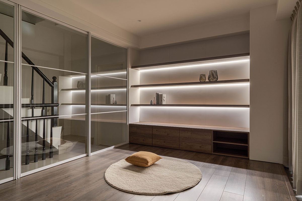 To satisfy the homeowner’s requirement for natural light, the designer meticulously preserved the dual-aspect windows on each floor. In the first-floor shared areas, a pony wall is strategically positioned to serve as a TV wall, ensuring unimpeded access for sunlight to stream in. In the master bedroom, waist-high windows alongside the bed back wall, combined with wood-patterned sliding doors, enable residents to adjust the amount of incoming light according to their preferences, thus achieving a pleasant and cozy circumstance.
